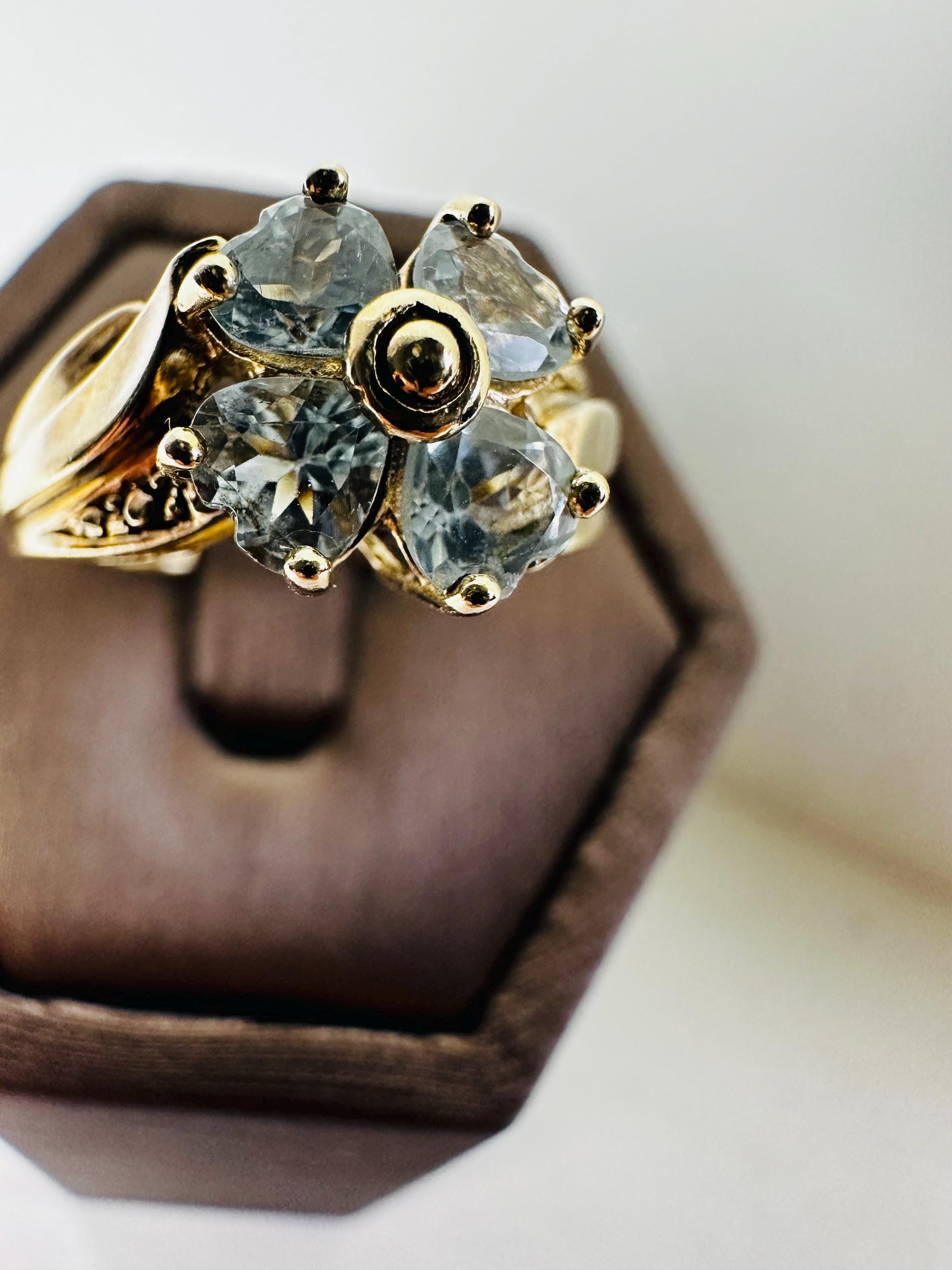 Discover this exquisite vintage 9ct gold aquamarine ring, a stunning piece that embodies mid-20th-century elegance. This ring features a captivating aquamarine gemstone, celebrated for its serene blue hues, nestled among an intricate floral motif.