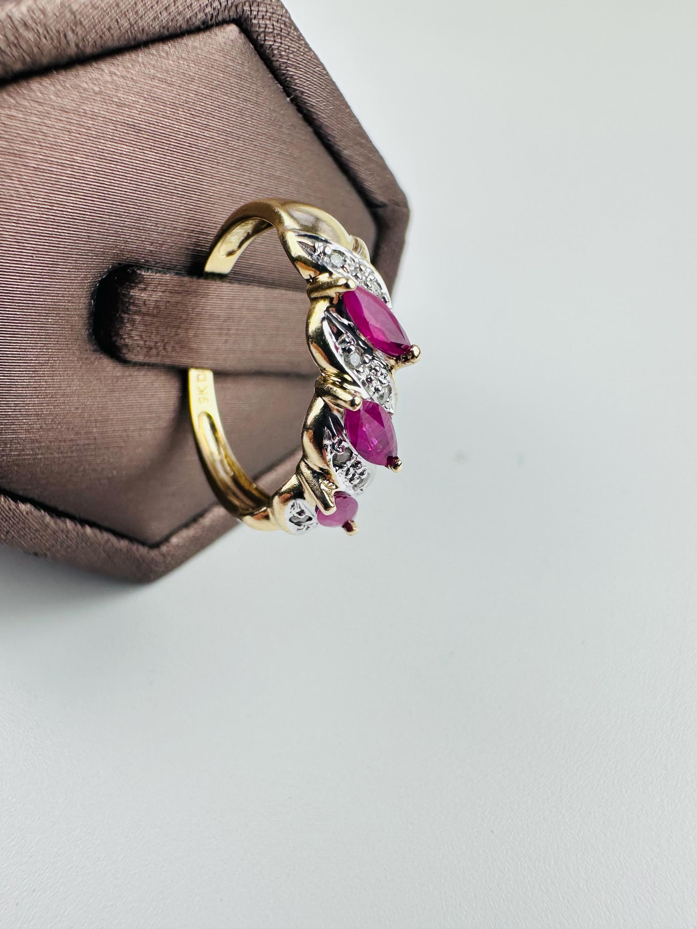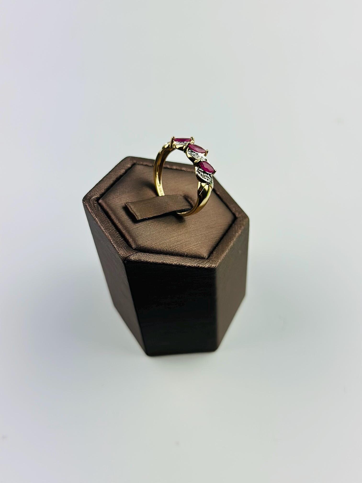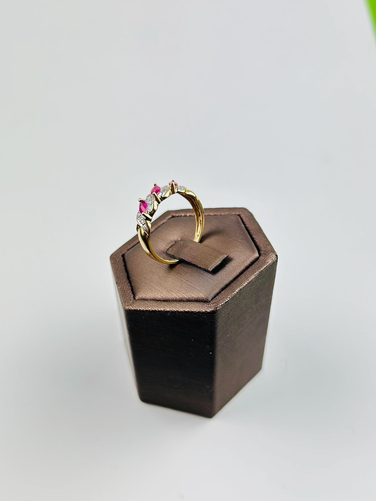 Discover this exquisite vintage 9K gold ring, beautifully adorned with natural rubies and brilliant diamonds. This stunning piece, reminiscent of the Art Deco era, showcases a unique intertwining design that captures the essence of vintage glamour.
