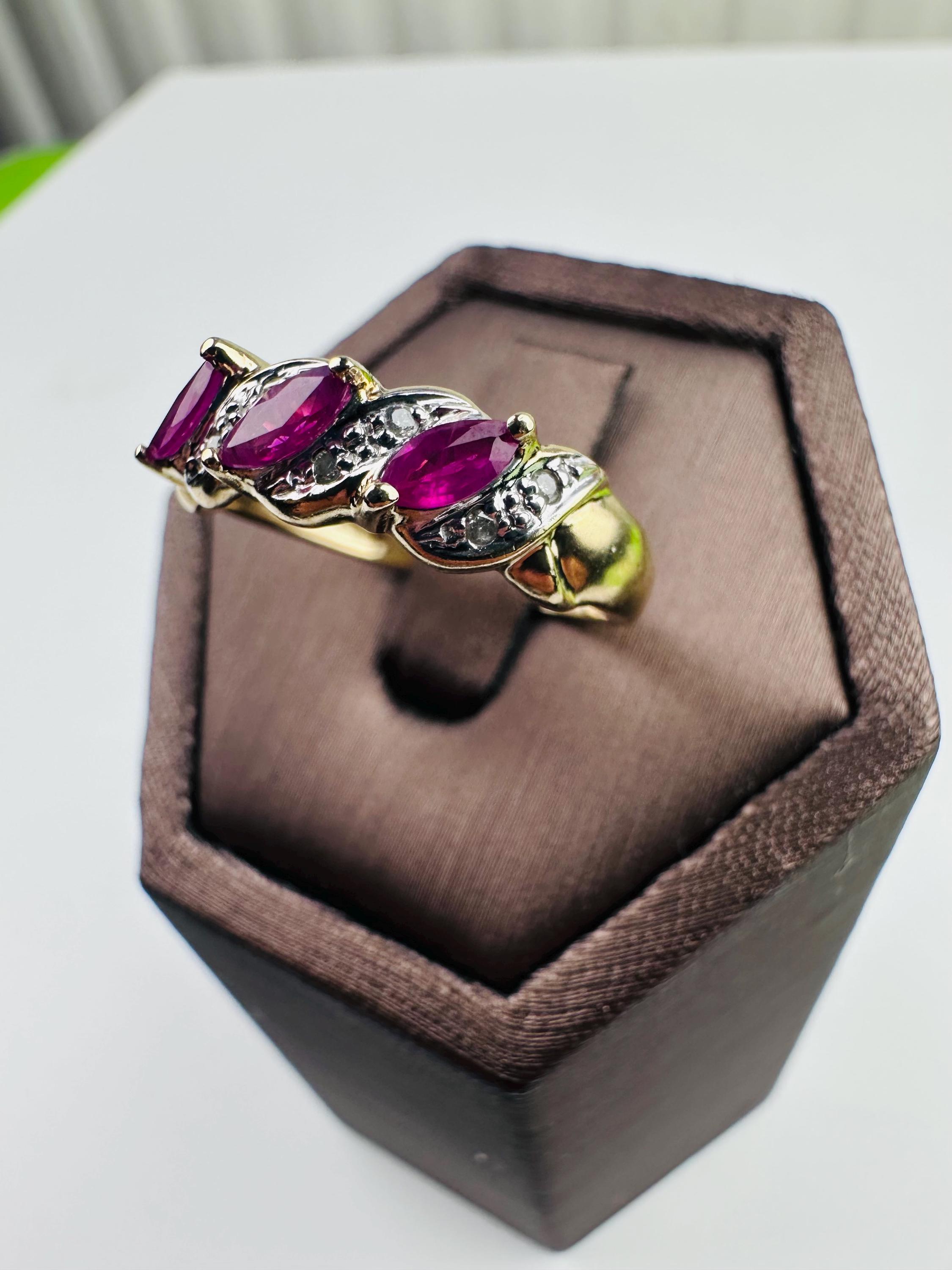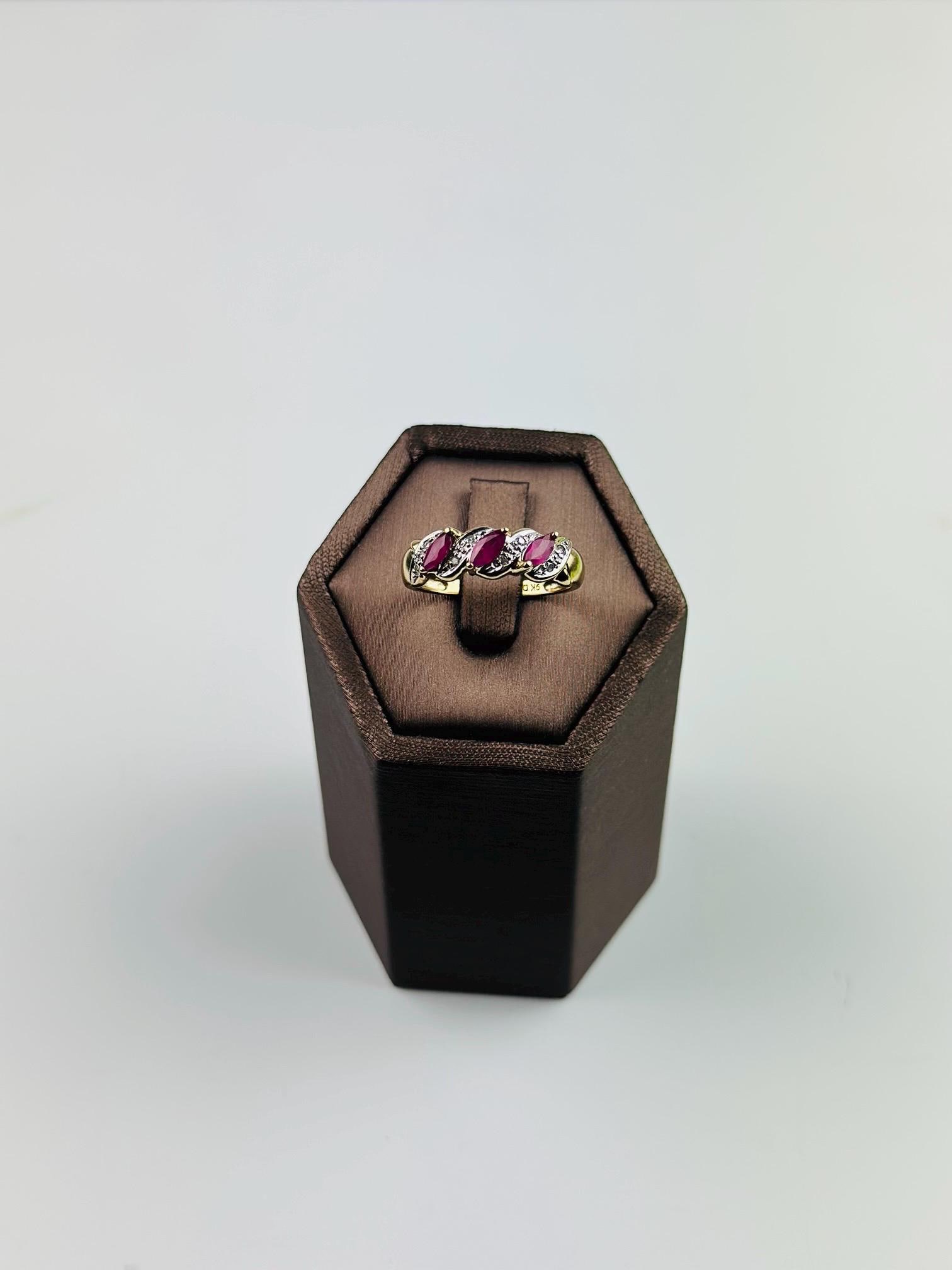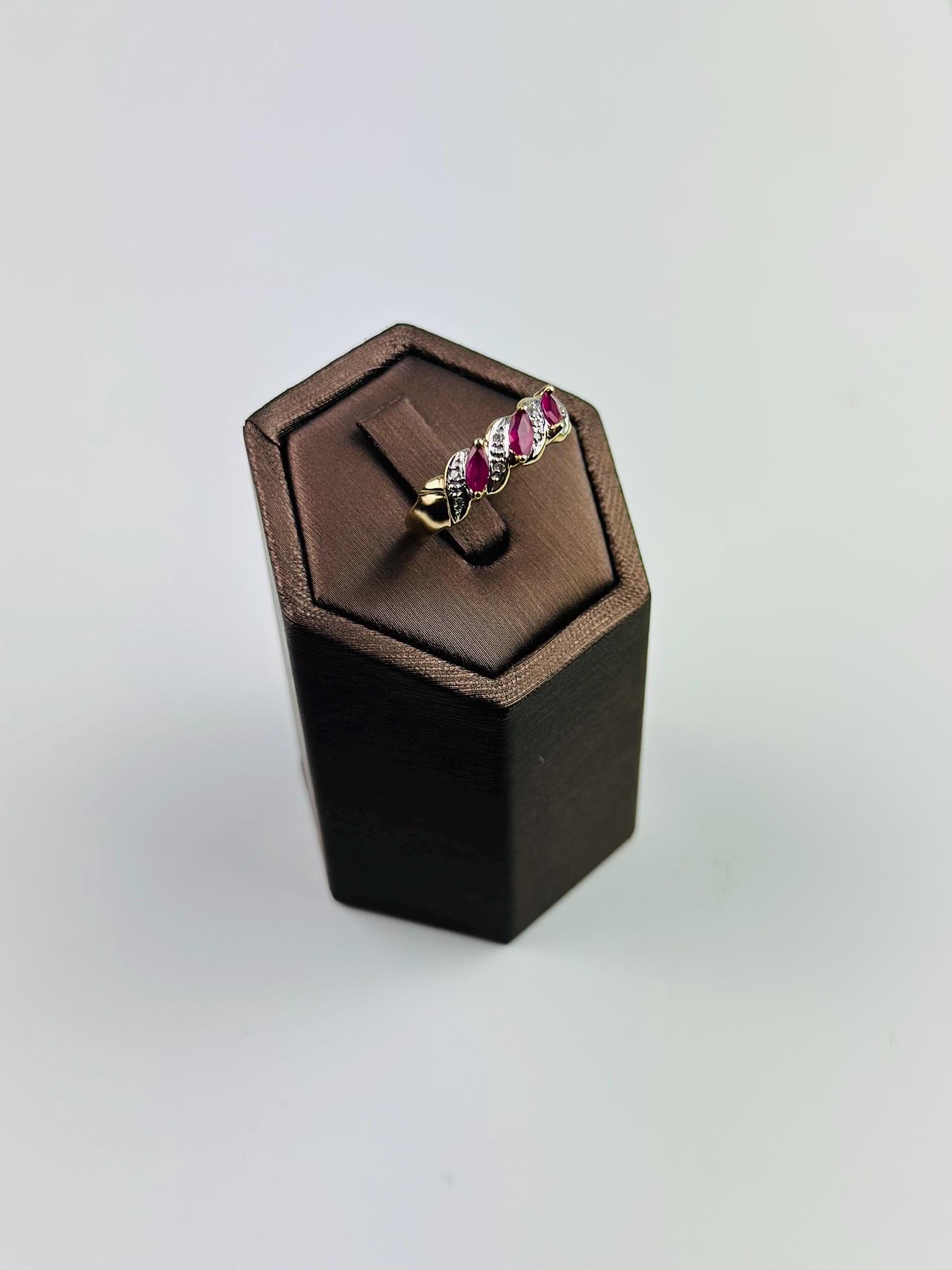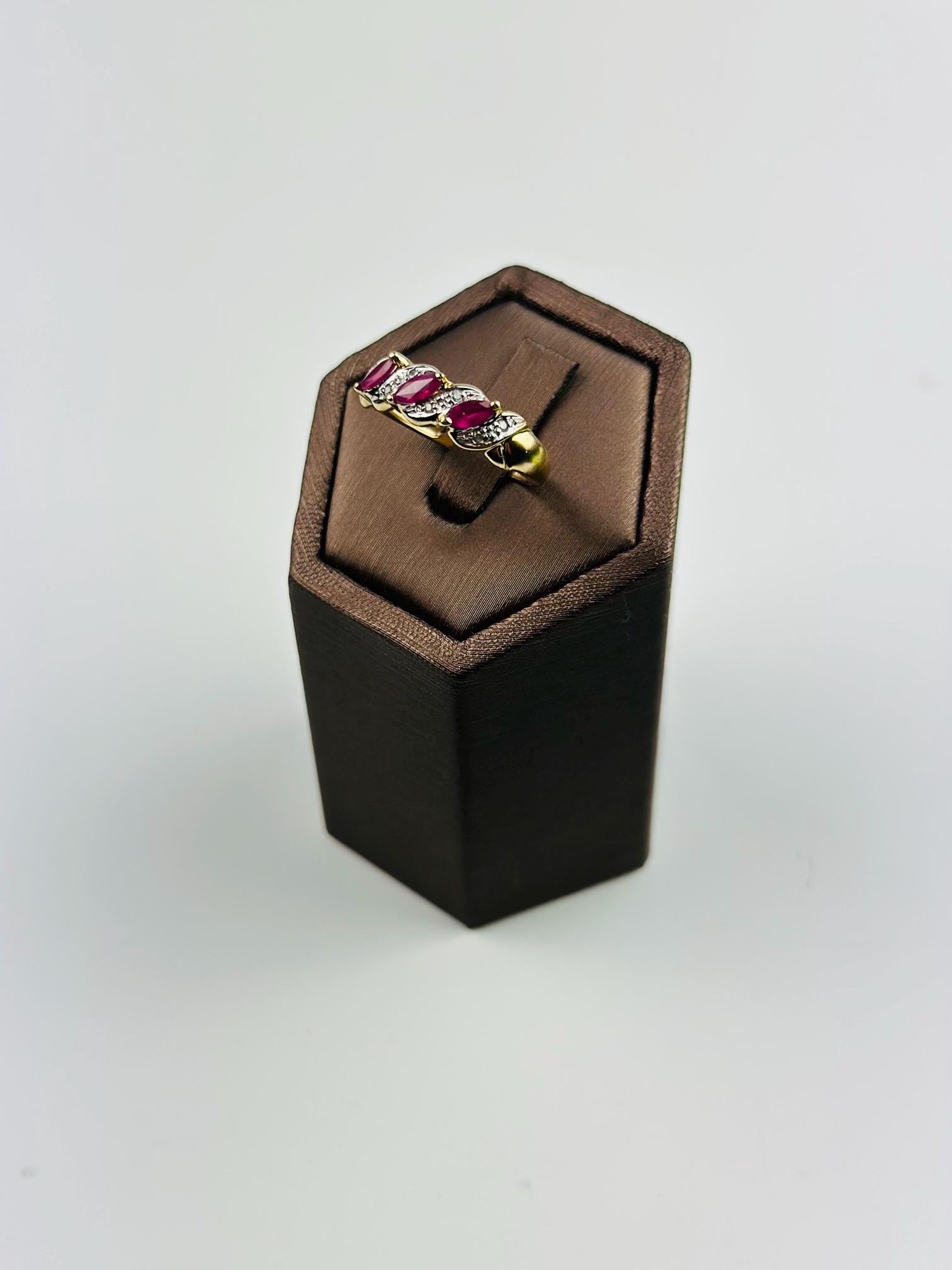 Discover this exquisite vintage 9K gold ring, beautifully adorned with natural rubies and brilliant diamonds. This stunning piece, reminiscent of the Art Deco era, showcases a unique intertwining design that captures the essence of vintage glamour.