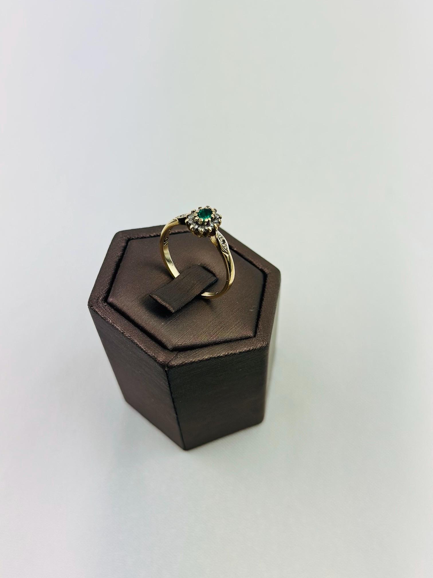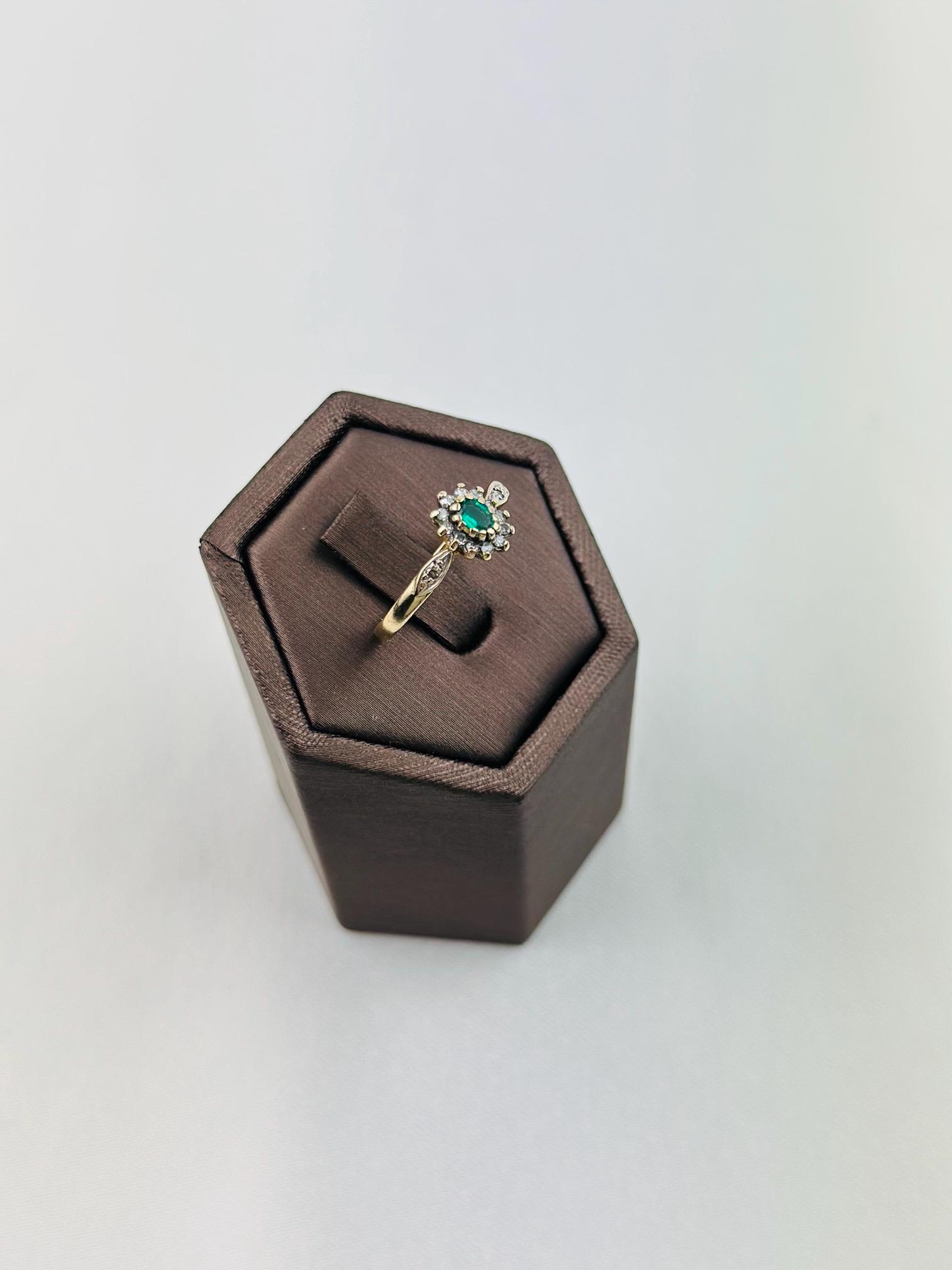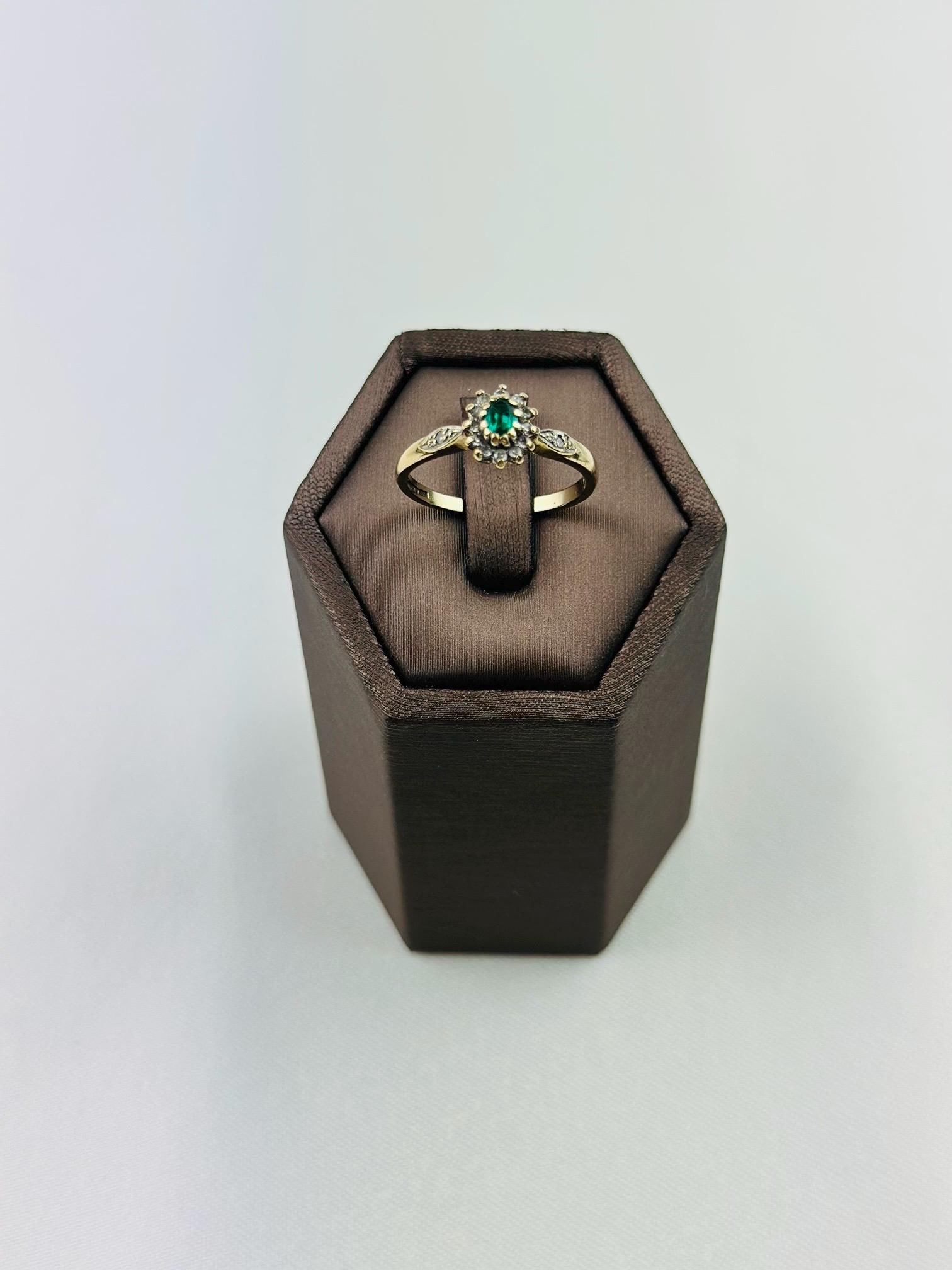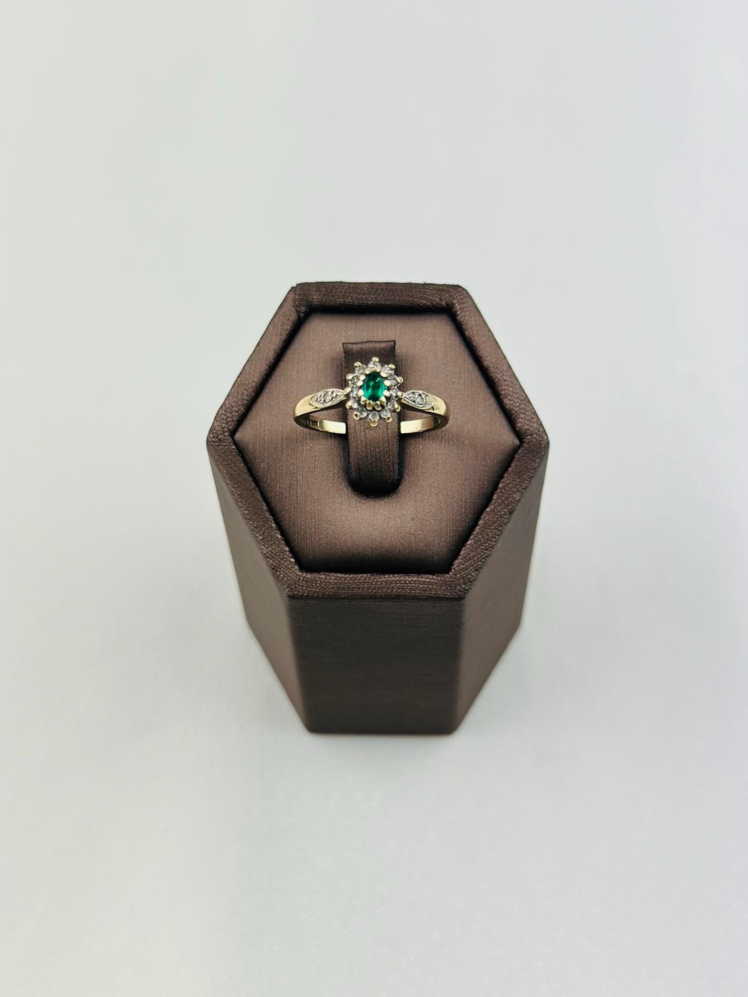 Discover the timeless beauty of this vintage 9ct gold ring, expertly crafted and hallmarked for authenticity. Adorned with a stunning emerald gemstone at its center, this ring captures the essence of elegance and sophistication. Flanked by sparkling diamonds, it provides a breathtaking contrast that highlights the rich green hue of the emerald.