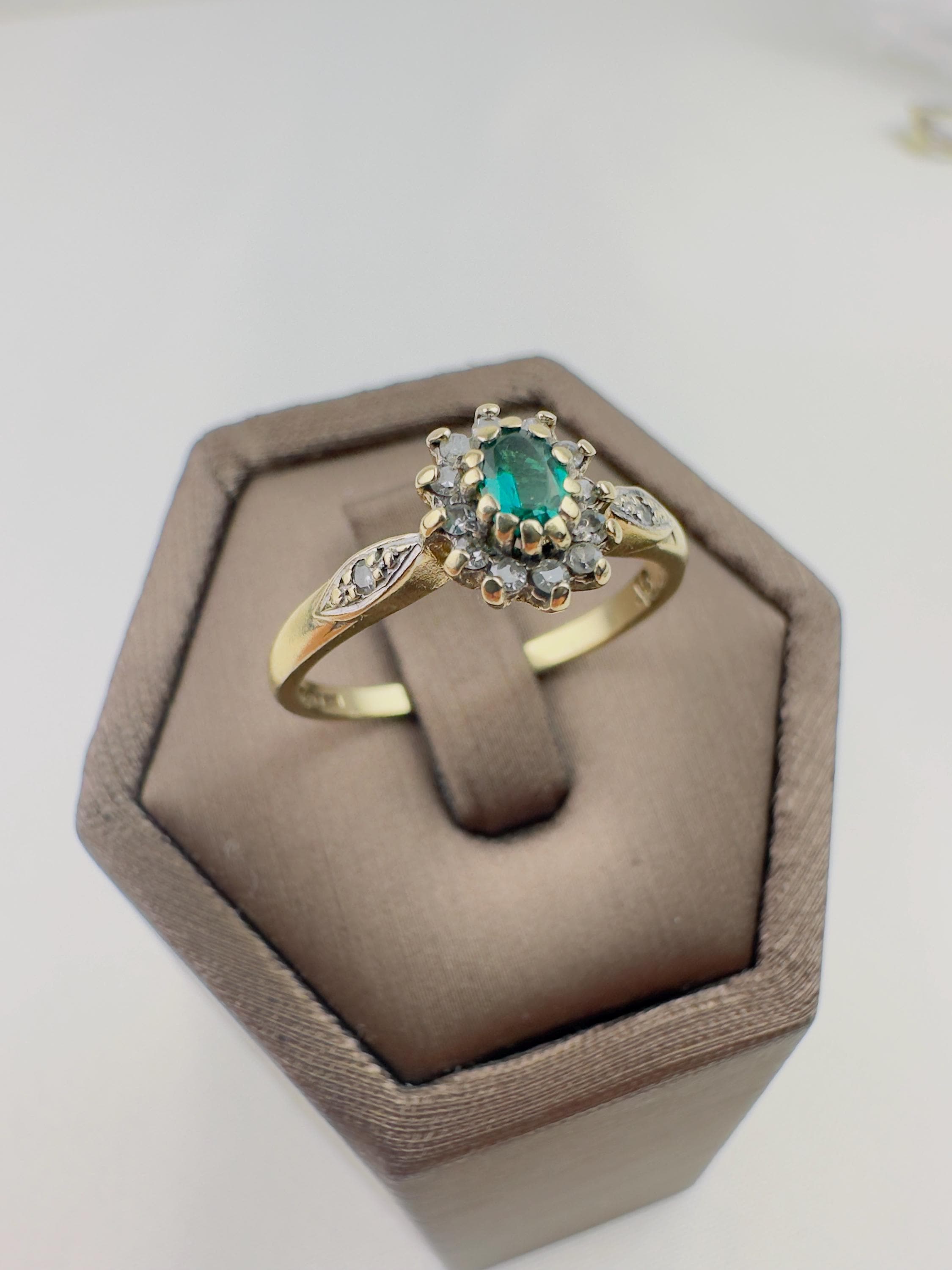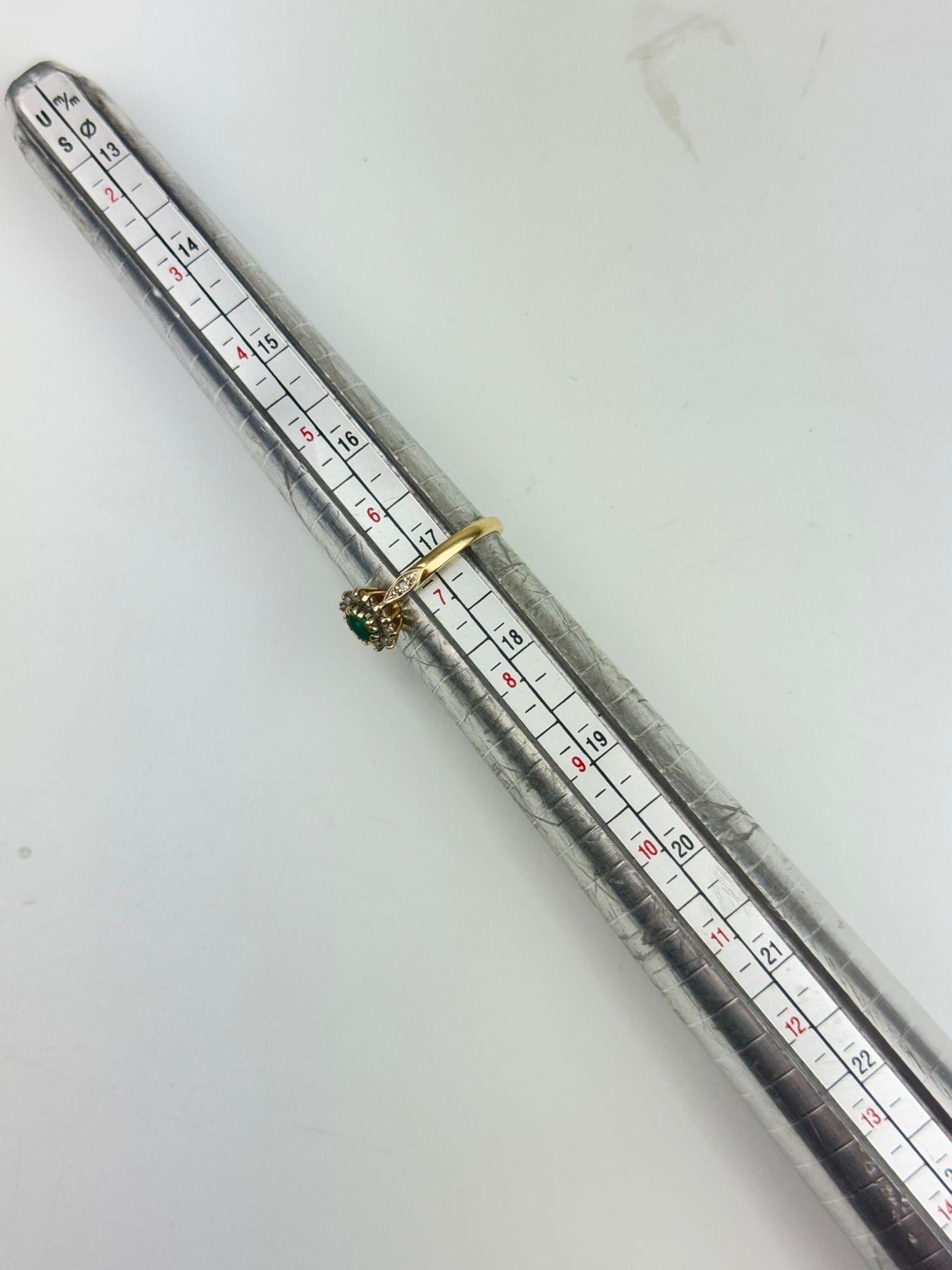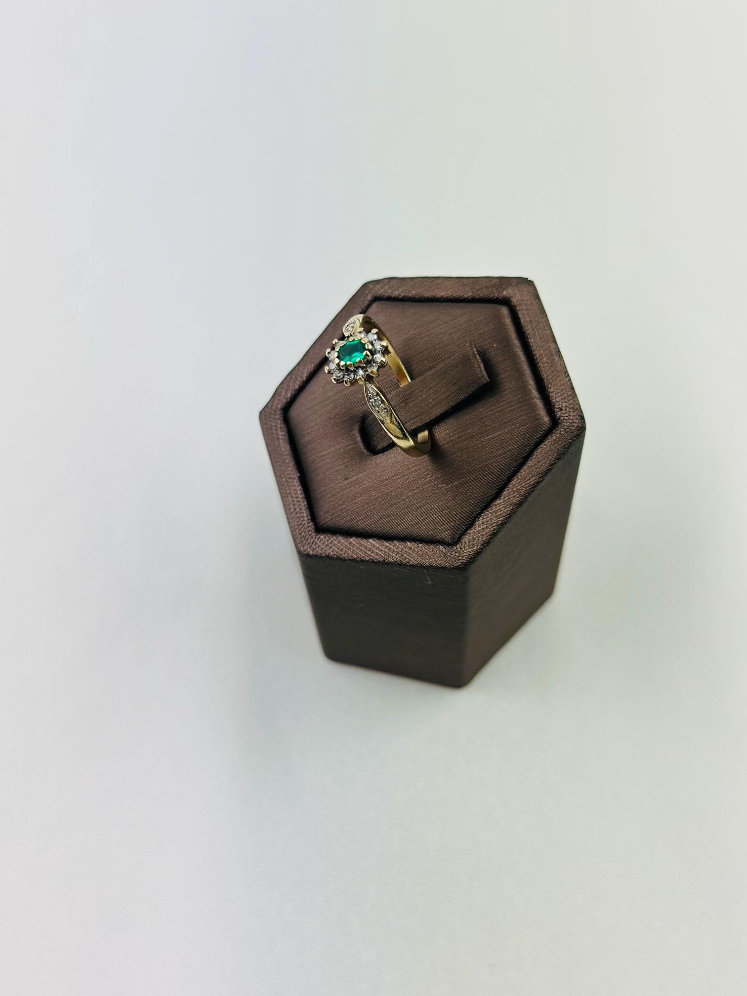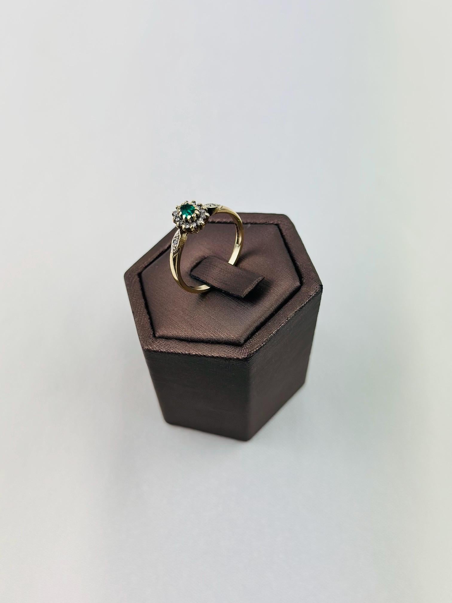 Discover the timeless beauty of this vintage 9ct gold ring, expertly crafted and hallmarked for authenticity. Adorned with a stunning emerald gemstone at its center, this ring captures the essence of elegance and sophistication. Flanked by sparkling diamonds, it provides a breathtaking contrast that highlights the rich green hue of the emerald.