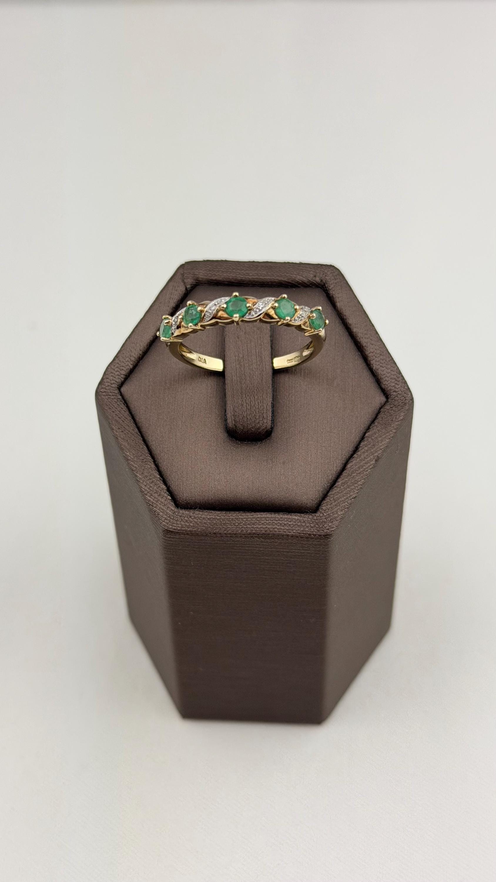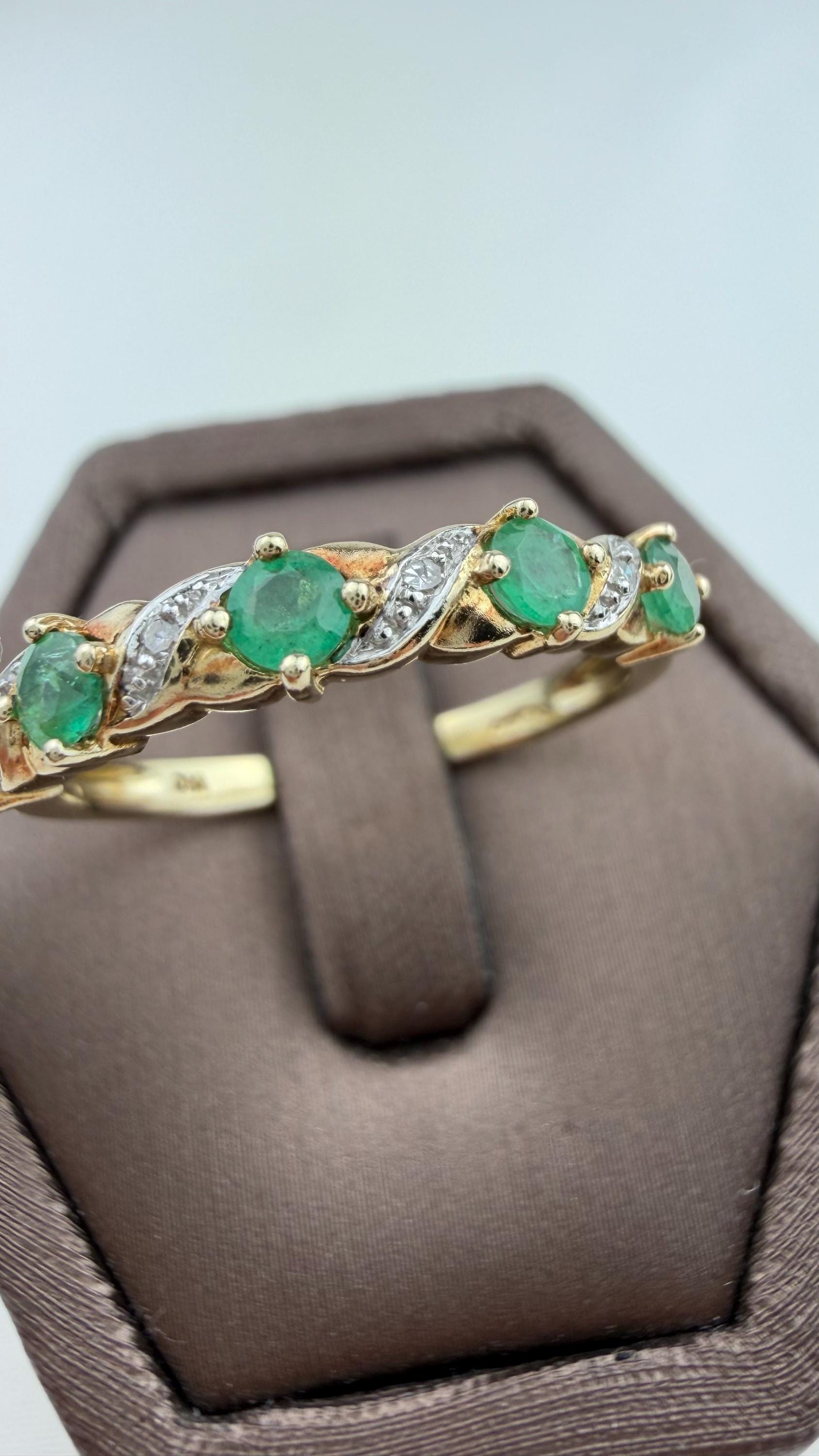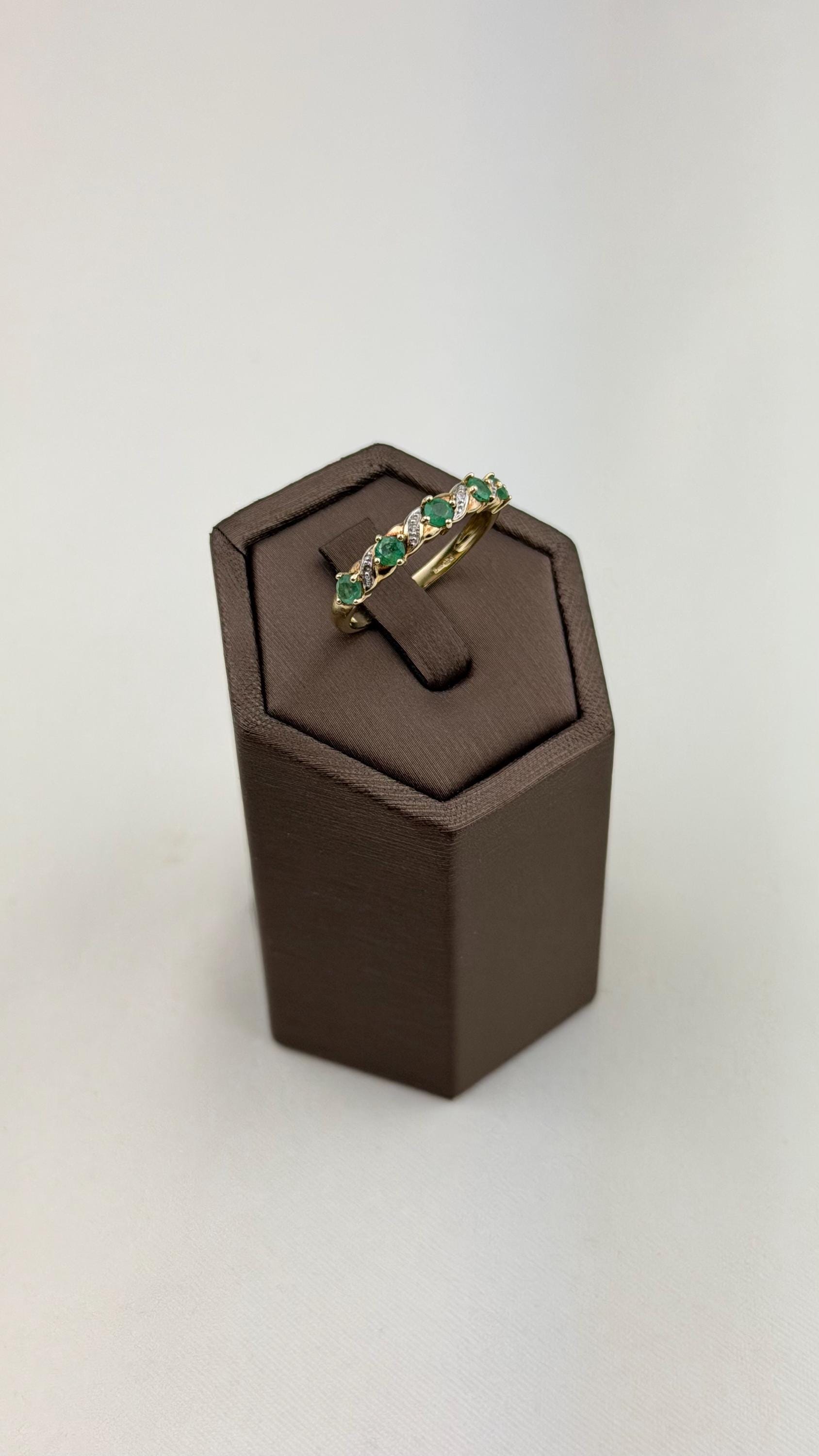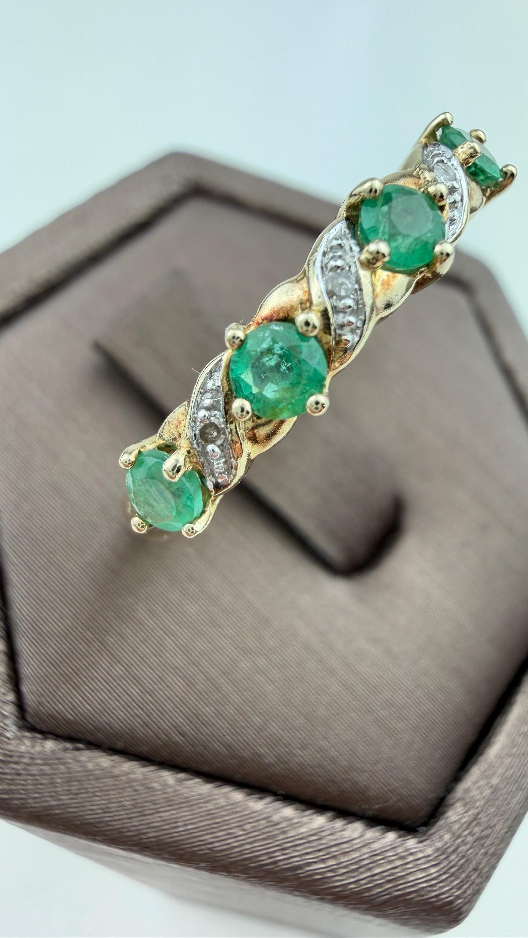 Discover timeless elegance with this vintage 9ct gold emerald and diamond ring, a stunning piece of mid-century jewelry. Hallmarked for authenticity, this exquisite ring features five vibrant pear-shaped emeralds and sparkling diamond accents that beautifully complement the warm hue of the gold.