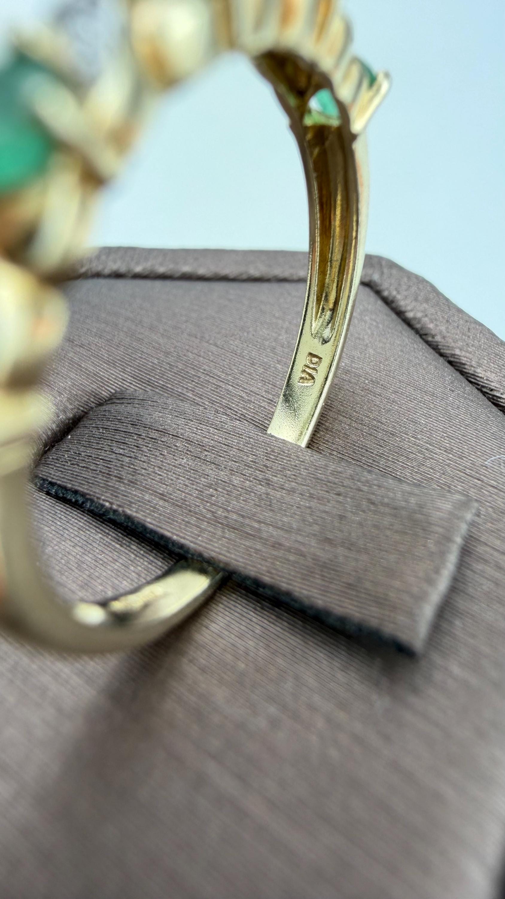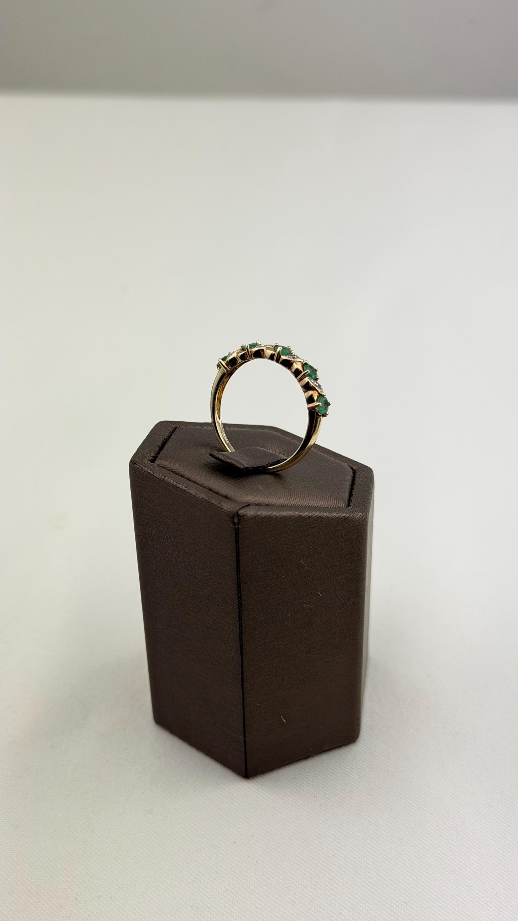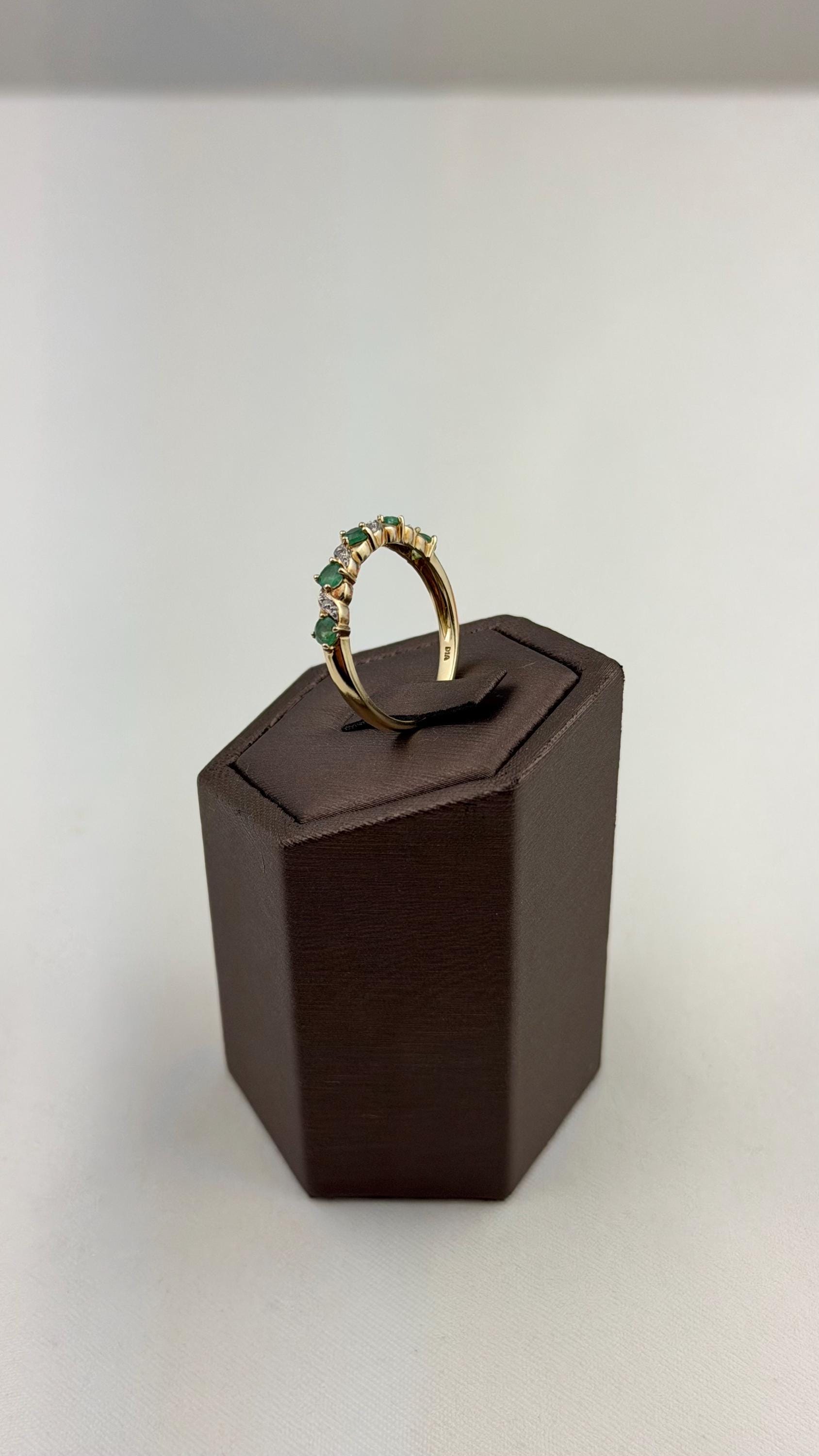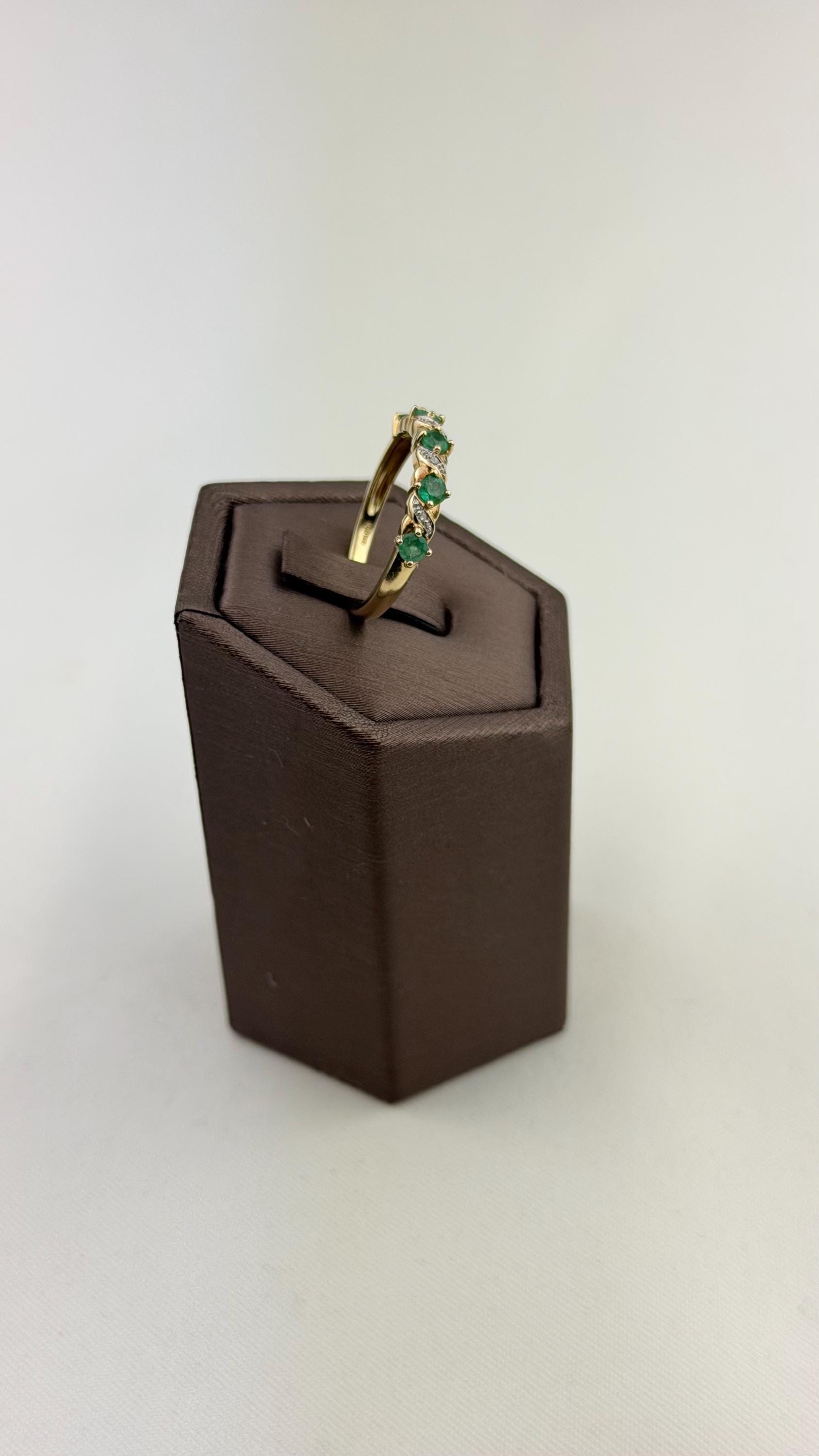 Discover timeless elegance with this vintage 9ct gold emerald and diamond ring, a stunning piece of mid-century jewelry. Hallmarked for authenticity, this exquisite ring features five vibrant pear-shaped emeralds and sparkling diamond accents that beautifully complement the warm hue of the gold.