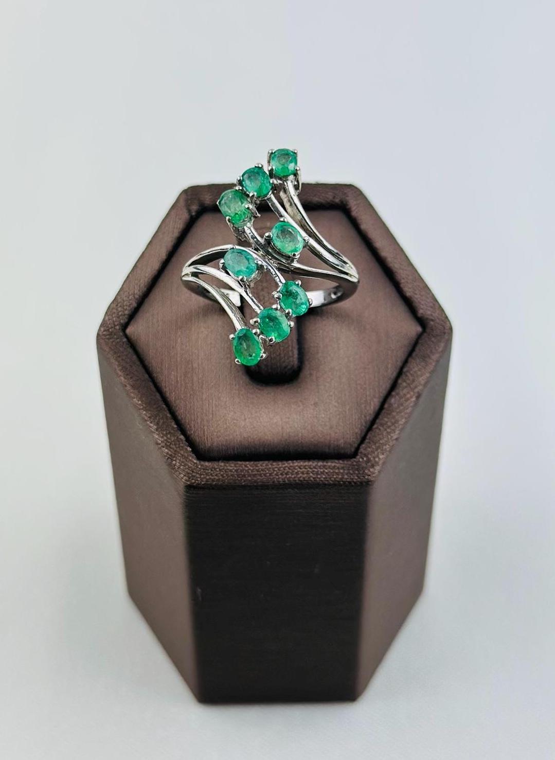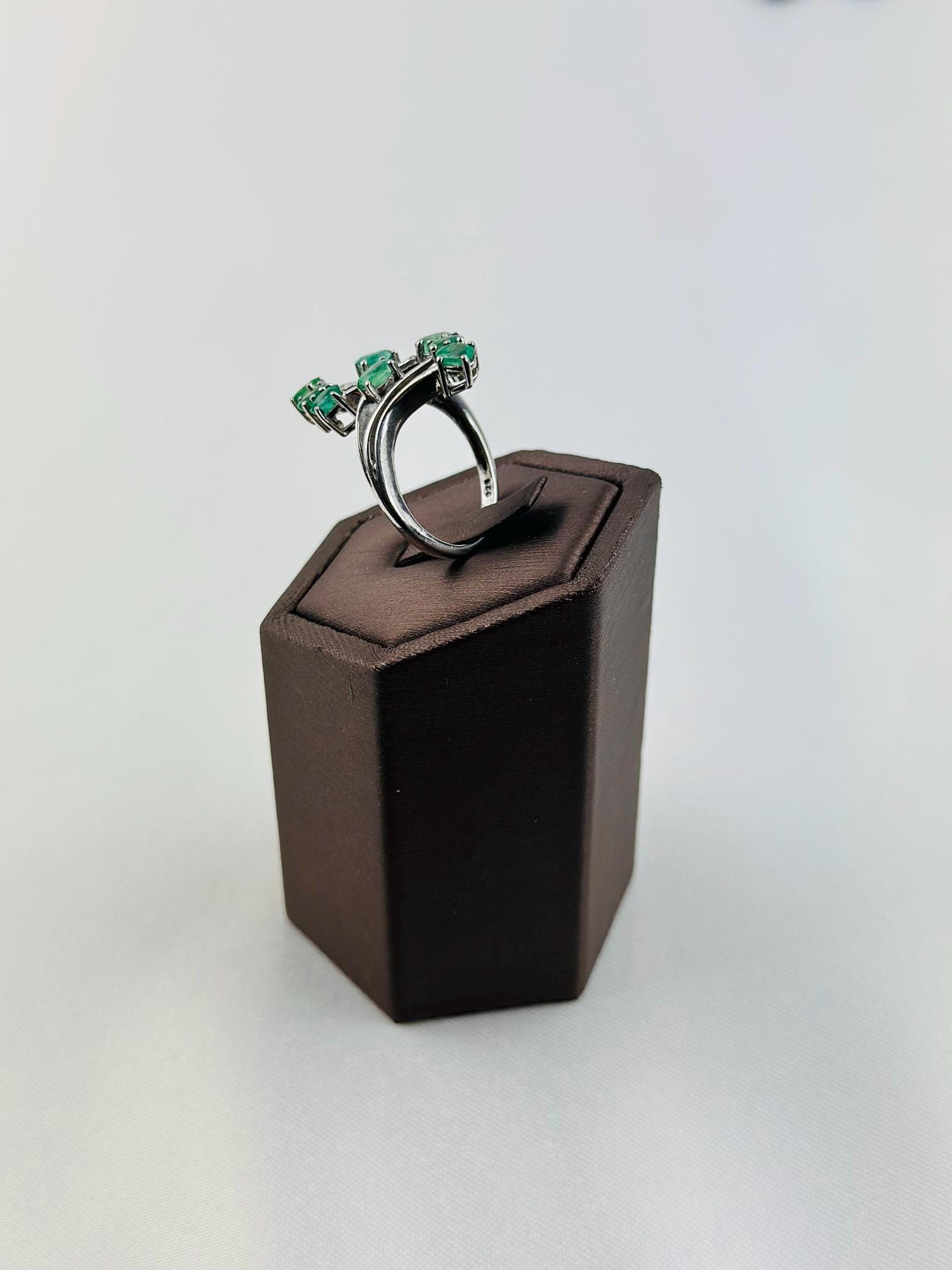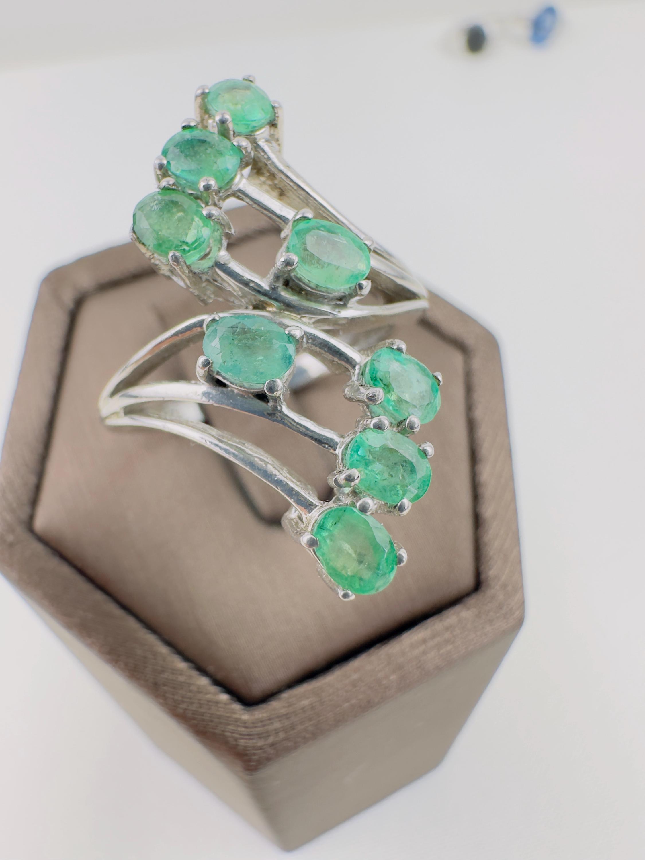 This stunning vintage emerald cluster ring features vibrant natural emerald gemstones mined from Colombia, set in elegant hallmarked 925 sterling silver. The graceful curved design showcases multiple brilliant green emeralds arranged in a flowing cluster, creating a sophisticated and eye-catching statement piece.
