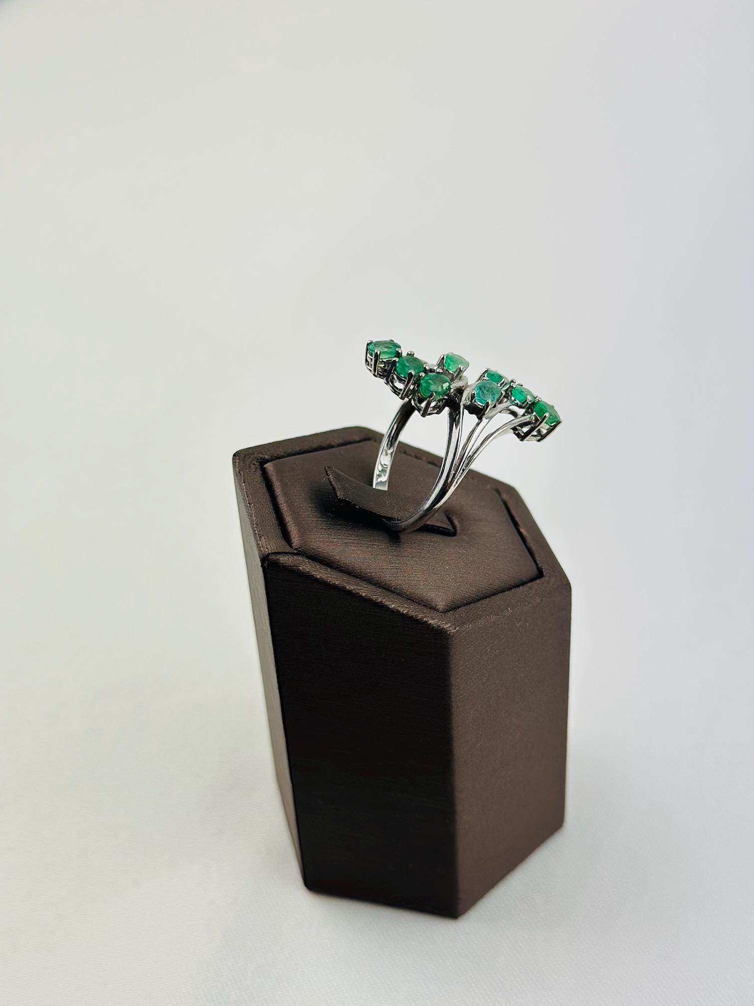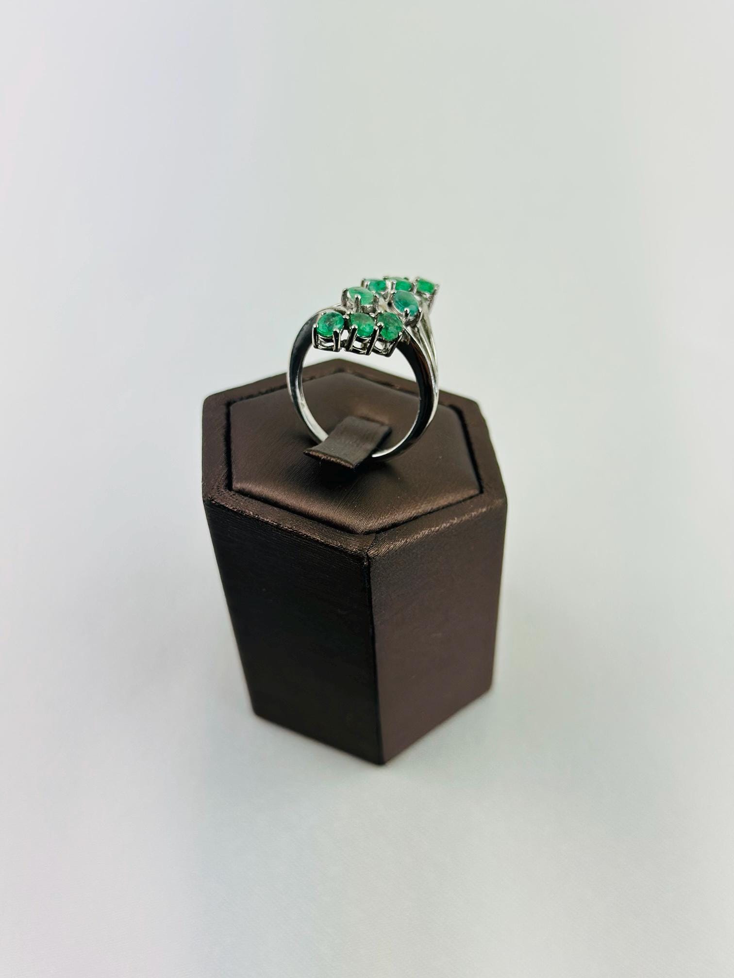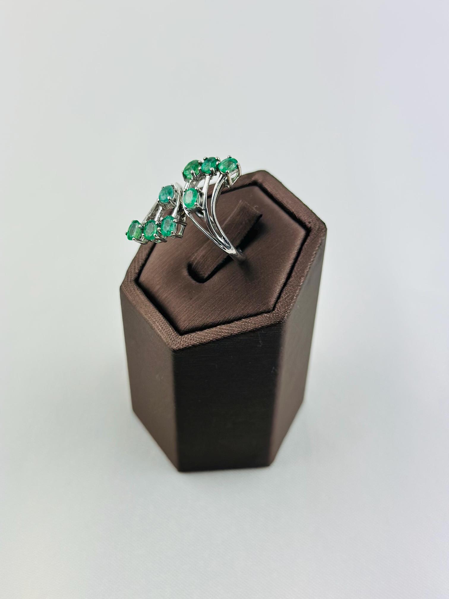 This stunning vintage emerald cluster ring features vibrant natural emerald gemstones mined from Colombia, set in elegant hallmarked 925 sterling silver. The graceful curved design showcases multiple brilliant green emeralds arranged in a flowing cluster, creating a sophisticated and eye-catching statement piece.