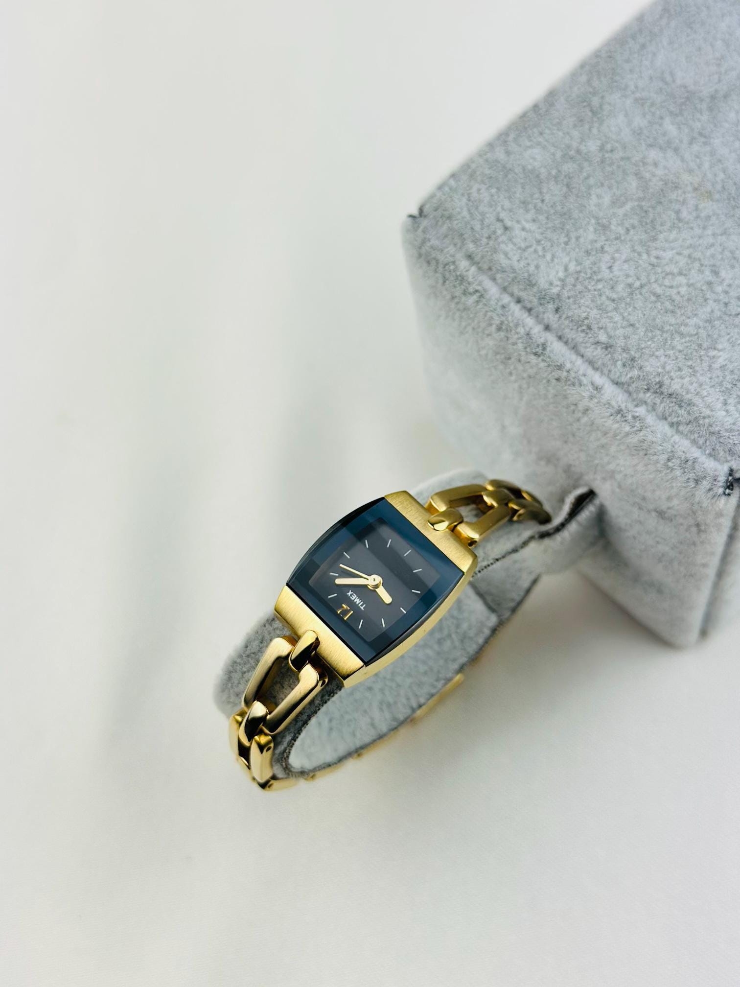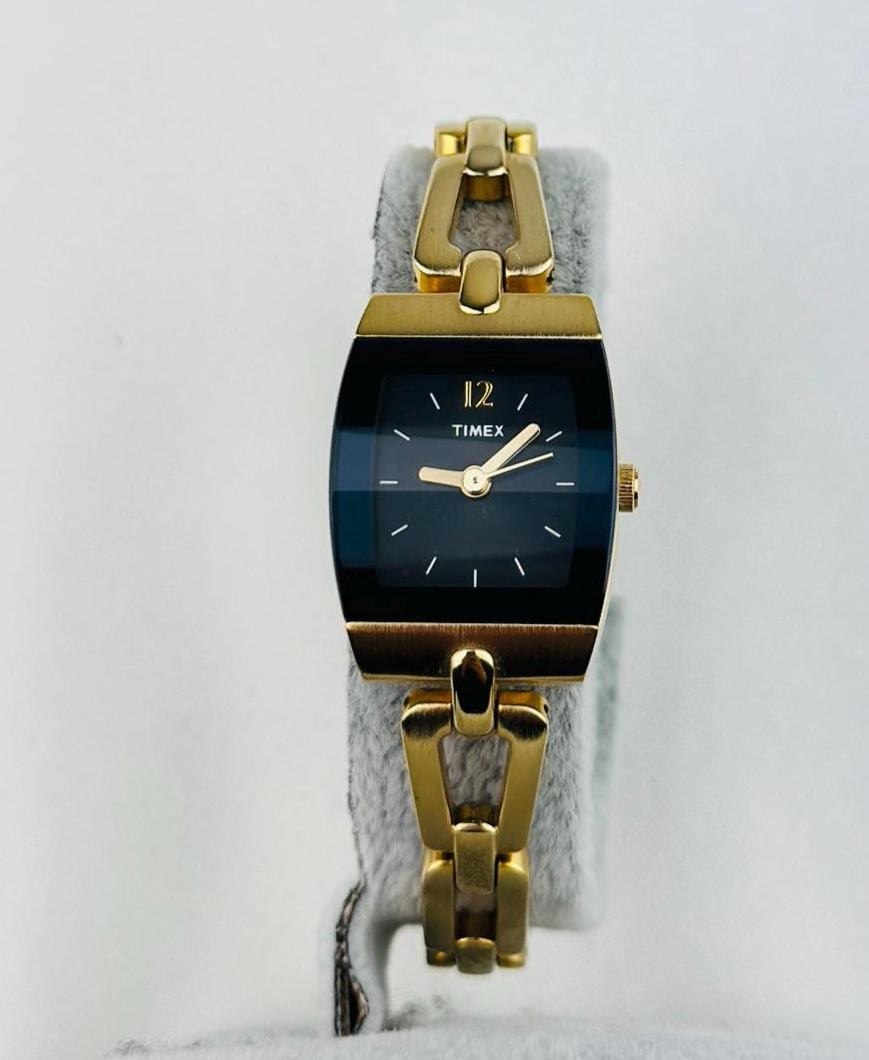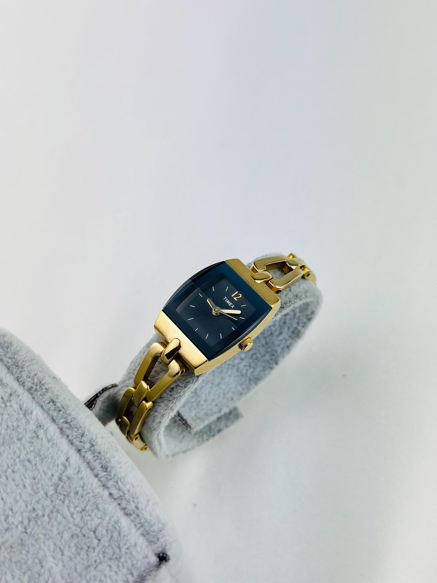 This elegant vintage quartz watch by Timex features a stylish rectangular gold-tone case paired with a deep blue dial, creating a timeless and sophisticated look.