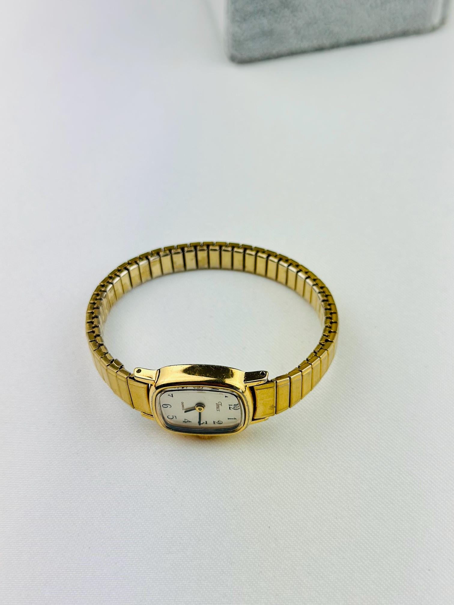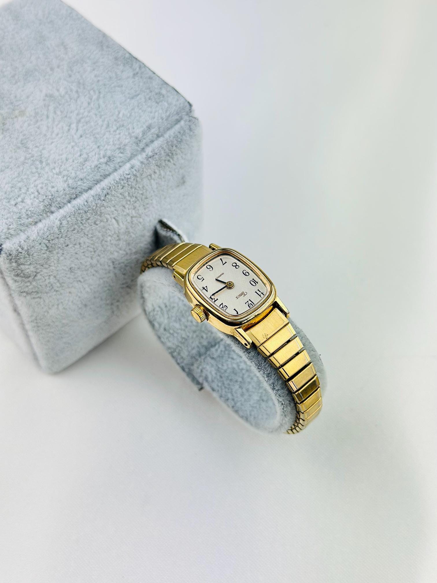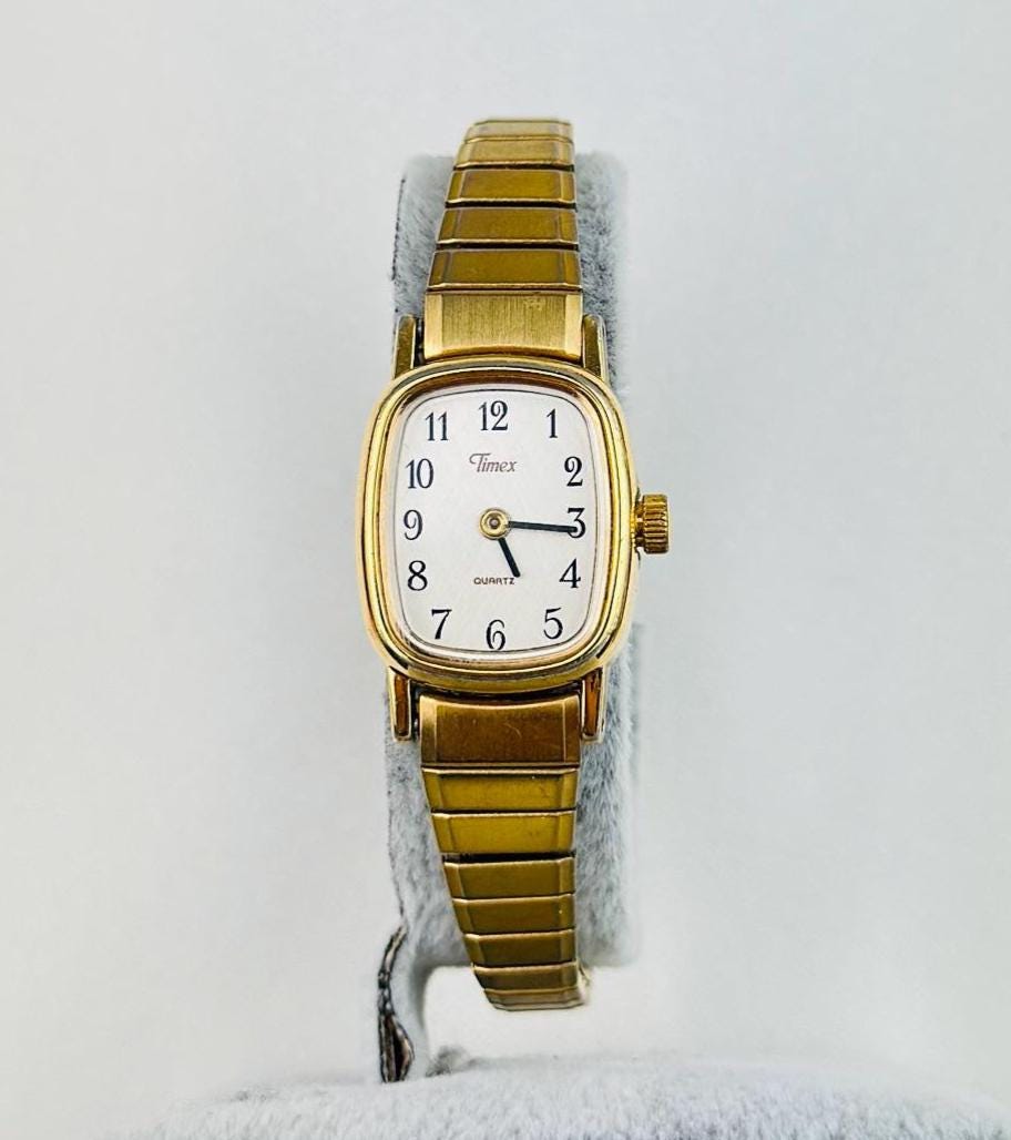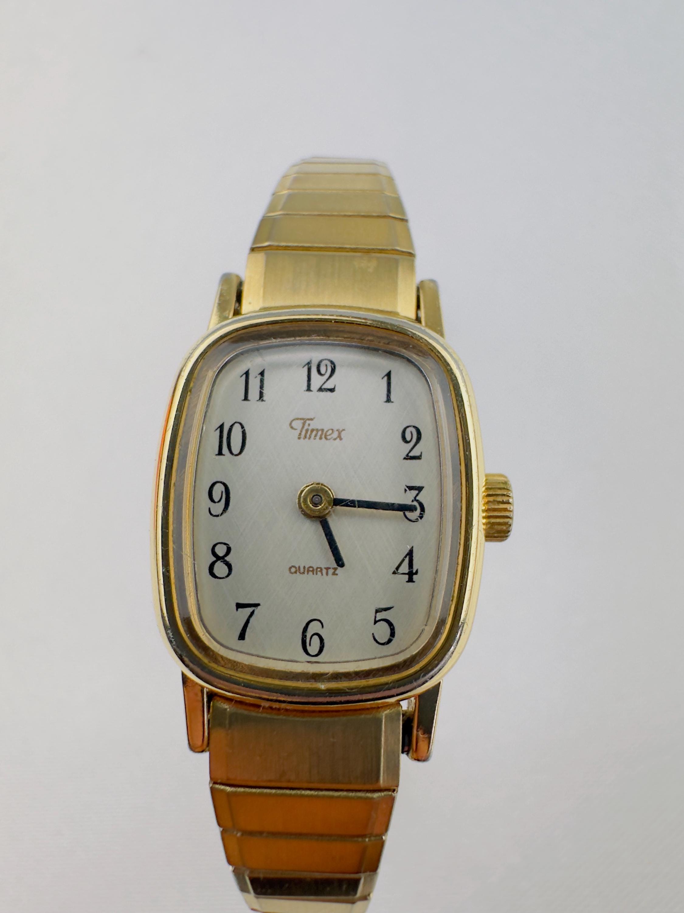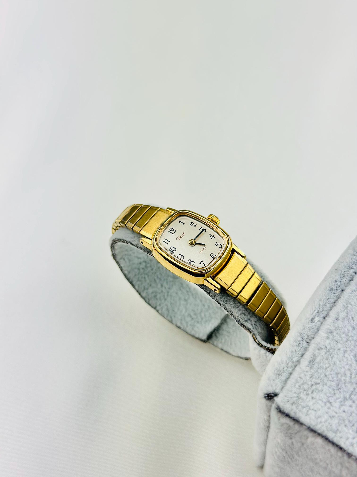 Vintage gold Timex watch stainless steel new battery fitted quartz movement, this is elegant stretchy bracelet watch , can be resized to a different band , water resistant tiny vintage elegant watch . Do not forget to add to your collection ,